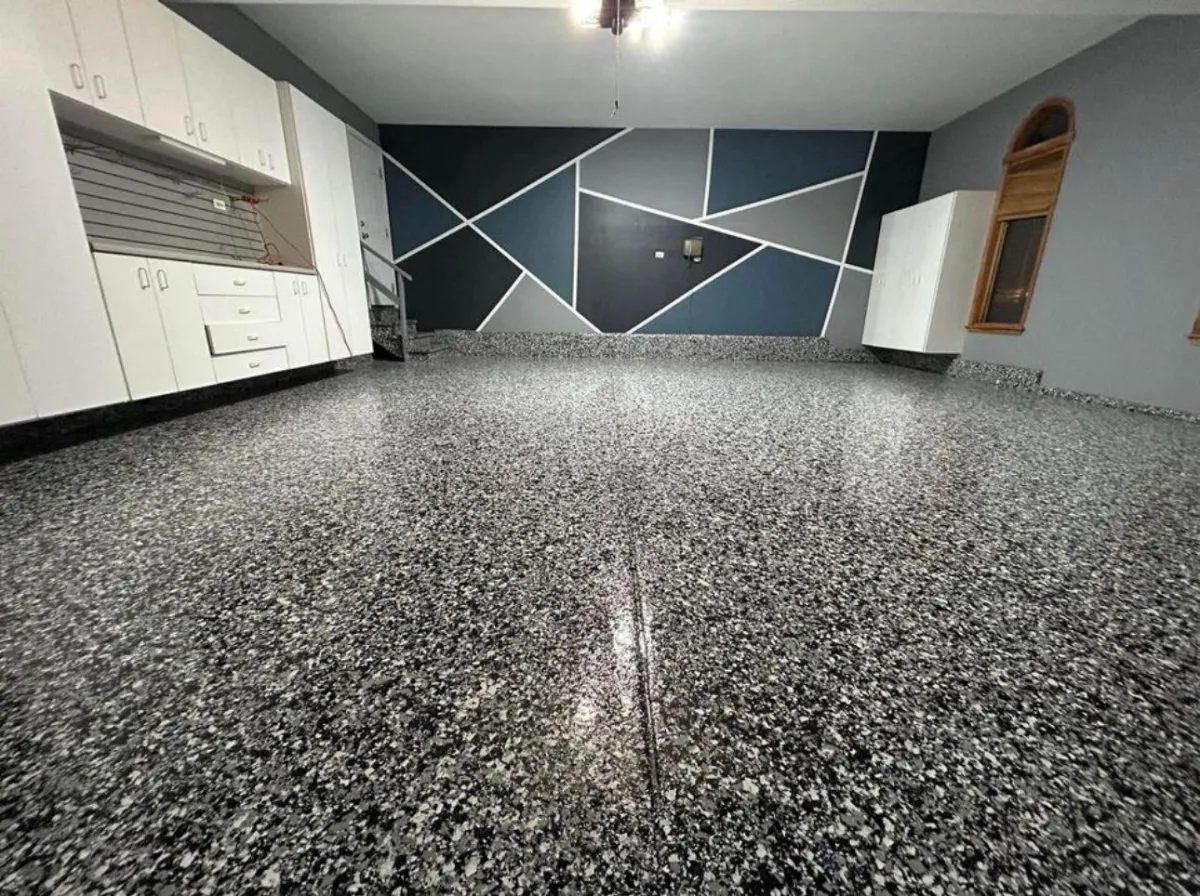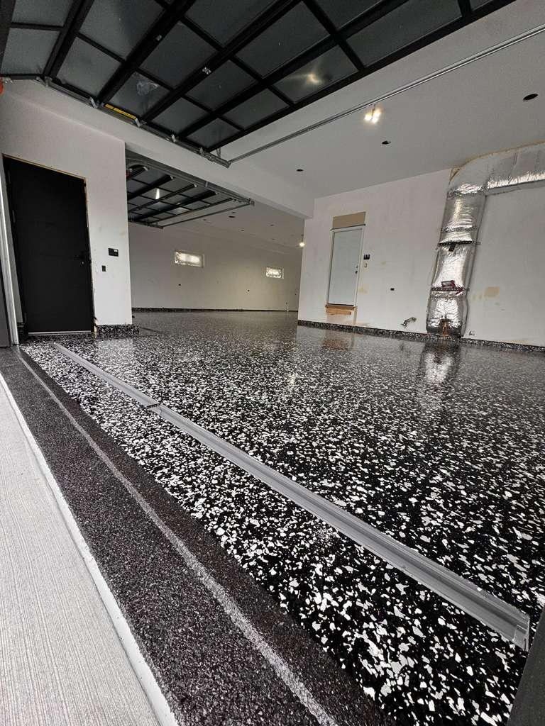 A multi-layered system comprising an epoxy base coat and vinyl flake chips, sealed with a polyaspartic or polyurethane topcoat. Water, stain, chip, and scratch-resistant — ideal for garages, patios, and busy commercial spaces.
